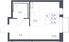 Студия № 319, 25.36 м2 с отделкой 11 эт.