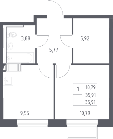 1-комнатная квартира № 93, 35.91 м2 с отделкой 4 эт.