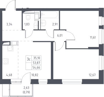3-комнатная квартира № 40, 53.69 м2 с отделкой 5 эт.