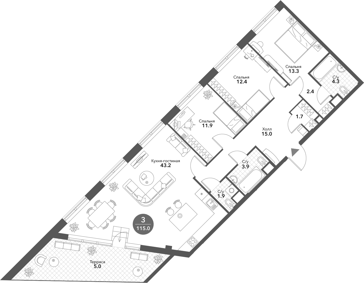 4-комнатная квартира № 52, 110.00 м2 без отделки 5 эт.