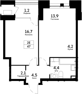 2-комнатная квартира № 24, 45.80 м2 без отделки 5 эт.