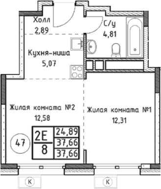 2-комнатная квартира № 47, 37.66 м2 без отделки 5 эт.