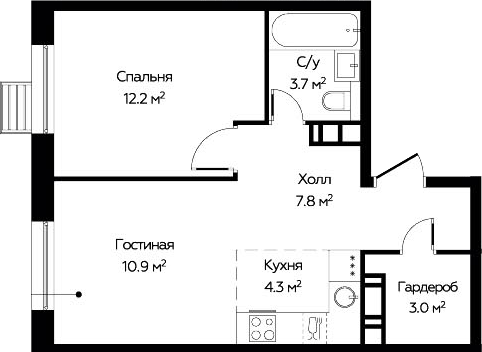 2-комнатная квартира № 411, 41.90 м2 без отделки 7 эт.