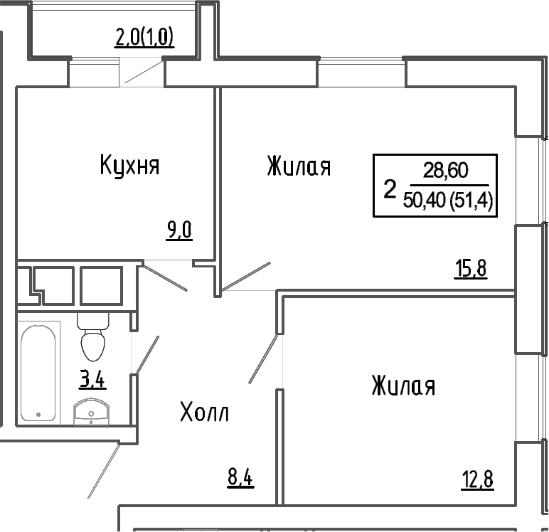 2-комнатная квартира № 32, 49.40 м2 без отделки 1 эт.