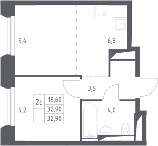 2-комнатная квартира № 22, 32.90 м2 с отделкой 4 эт.