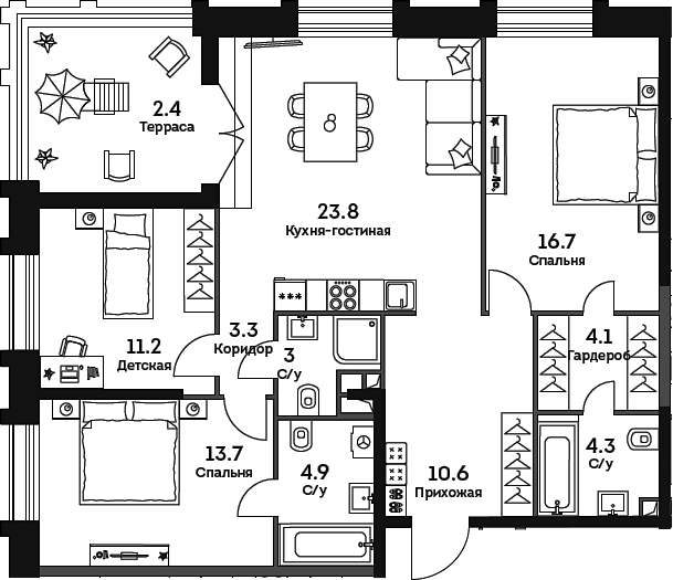 4-комнатная квартира № 255, 95.60 м2 без отделки 25 эт.