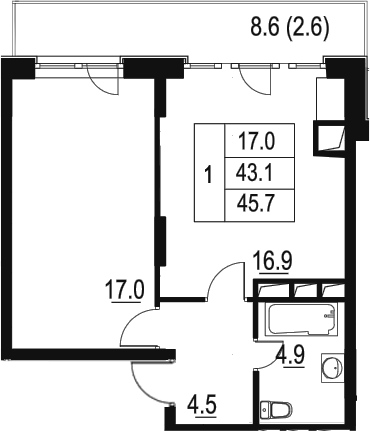 1-комнатная квартира № 14, 43.10 м2 без отделки 4 эт.