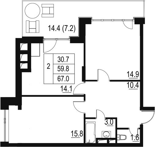 2-комнатная квартира № 13, 59.80 м2 без отделки 4 эт.