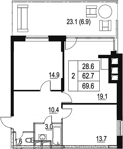 2-комнатная квартира № 17, 62.70 м2 без отделки 1 эт.