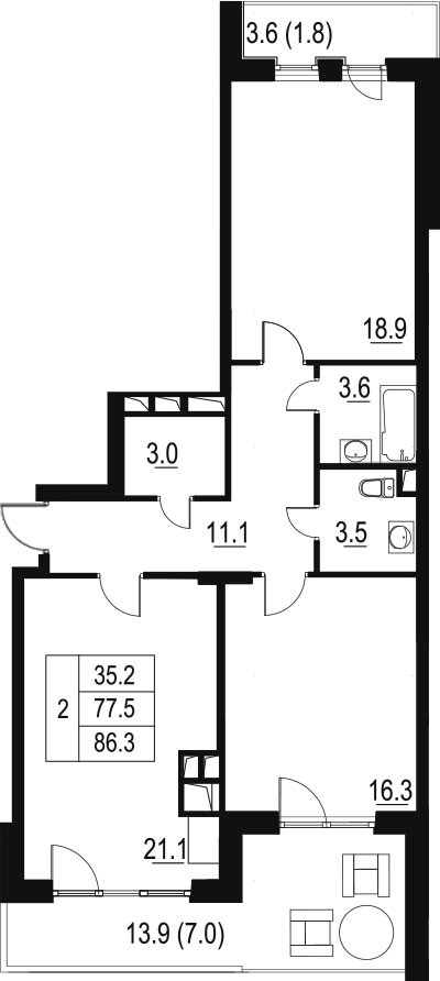 2-комнатная квартира № 11, 77.50 м2 без отделки 3 эт.