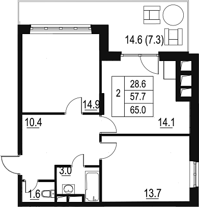 2-комнатная квартира № 21, 57.70 м2 без отделки 2 эт.