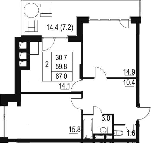 2-комнатная квартира № 13, 59.80 м2 без отделки 4 эт.