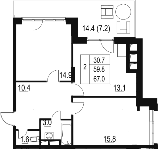 2-комнатная квартира № 29, 59.80 м2 без отделки 4 эт.