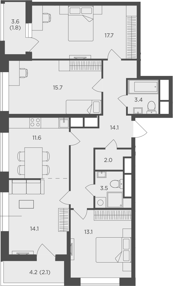 4-комнатная квартира № 243, 95.20 м2 без отделки 24 эт.