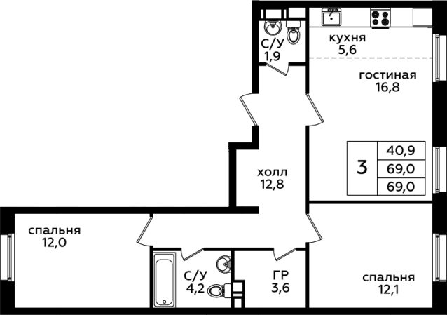 3-комнатная квартира № 105, 69.00 м2 без отделки 9 эт.