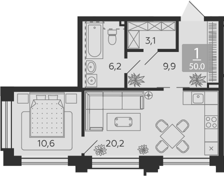 2-комнатная квартира № 125, 50.00 м2 без отделки 25 эт.