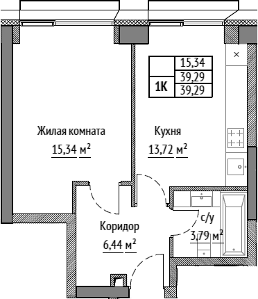 1-комнатная квартира № 390, 39.29 м2 без отделки 4 эт.