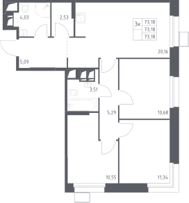 3-комнатная квартира № 42, 73.18 м2 с отделкой 3 эт.