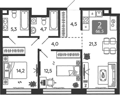 3-комнатная квартира № 328, 66.50 м2 без отделки 6 эт.