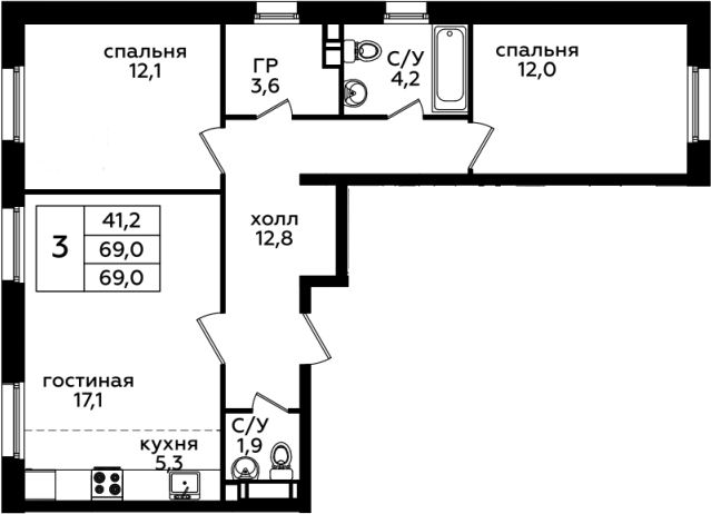 3-комнатная квартира № 591, 69.00 м2 с отделкой 14 эт.