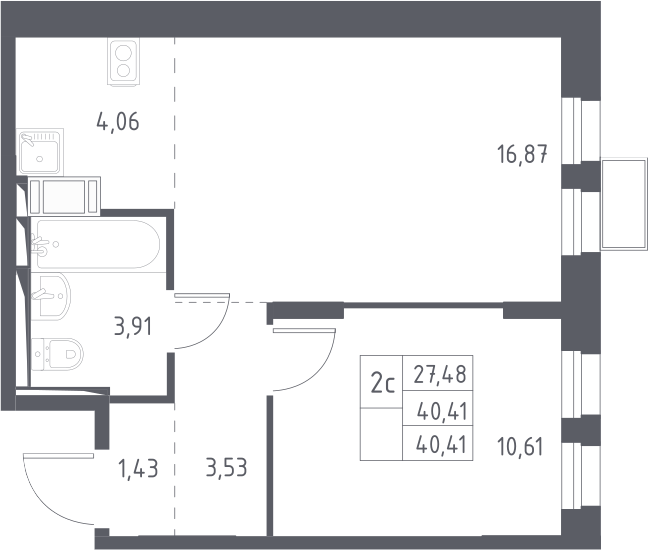 2-комнатная квартира № 225, 40.41 м2 с отделкой 12 эт.