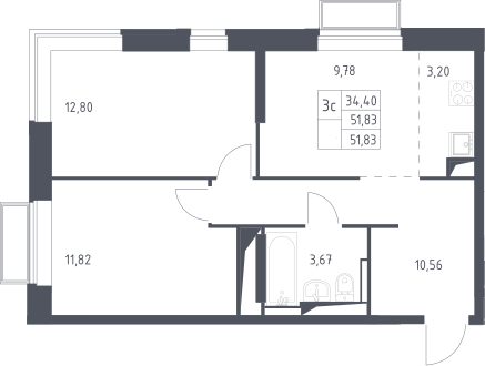 3-комнатная квартира № 92, 51.83 м2 с отделкой 11 эт.