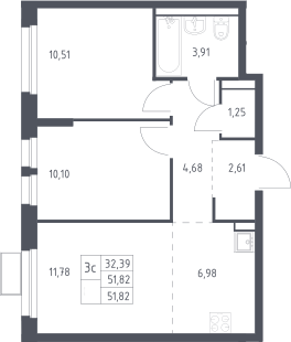 3-комнатная квартира № 764, 51.82 м2 с отделкой 17 эт.