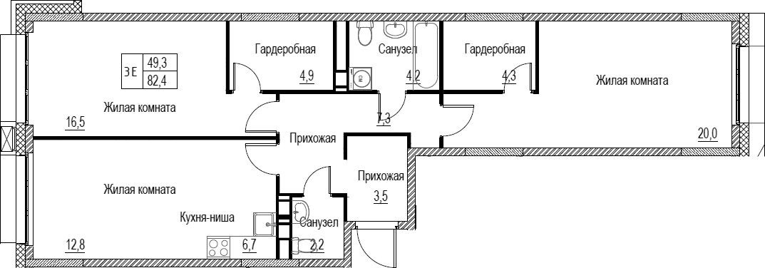 3-комнатная квартира № 315, 82.40 м2 без отделки 17 эт.