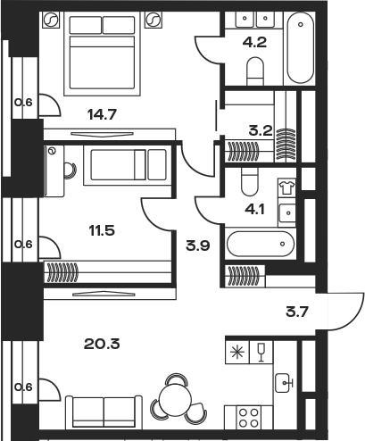 3-комнатная квартира № 166, 65.60 м2 с отделкой 7 эт.