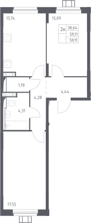 2-комнатная квартира № 274, 59.11 м2 с отделкой 13 эт.