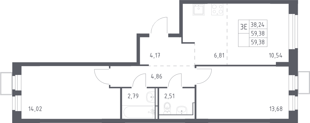 3-комнатная квартира № 482, 59.38 м2 с отделкой 4 эт.