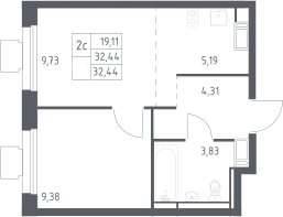 2-комнатная квартира № 37, 32.44 м2 с отделкой 5 эт.