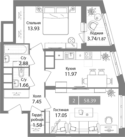 2-комнатная квартира № 8, 56.52 м2 без отделки 2 эт.