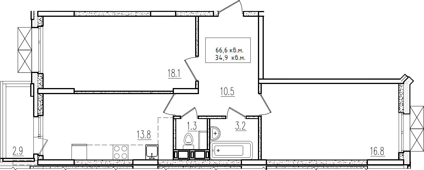 2-комнатная квартира № 117, 63.70 м2 без отделки 7 эт.