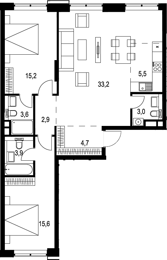 3-комнатная квартира № 15, 87.60 м2 без отделки 4 эт.