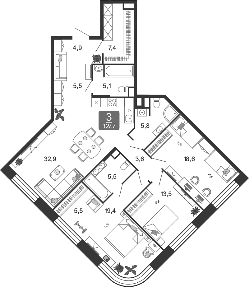 4-комнатная квартира № 4, 127.70 м2 без отделки 2 эт.