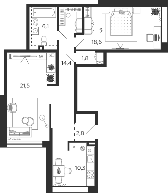 2-комнатная квартира № 58, 75.50 м2 без отделки 6 эт.