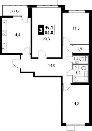 3-комнатная квартира № 415, 82.20 м2 с отделкой 13 эт.