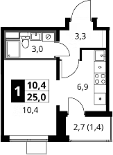 1-комнатная квартира № 43, 23.60 м2 с отделкой 8 эт.