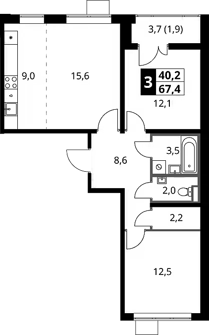 3-комнатная квартира № 82, 65.50 м2 с отделкой 2 эт.
