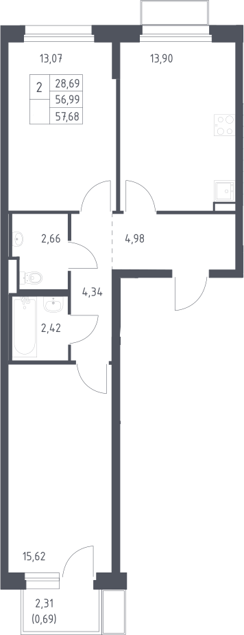 2-комнатная квартира № 201, 56.99 м2 с отделкой 6 эт.