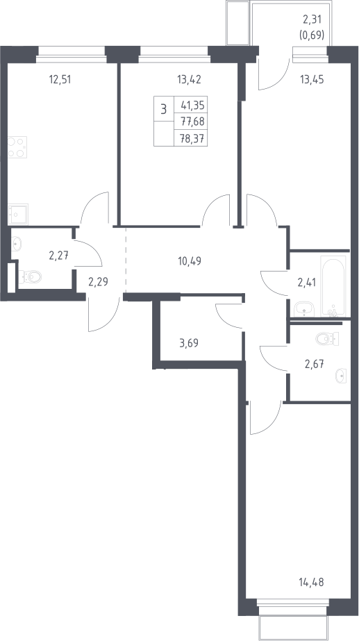 3-комнатная квартира № 302, 77.68 м2 с отделкой 14 эт.