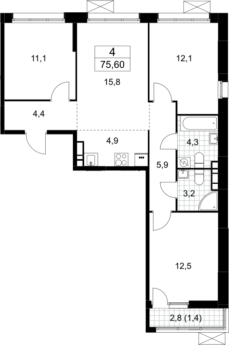 4-комнатная квартира № 25, 74.20 м2 без отделки 6 эт.