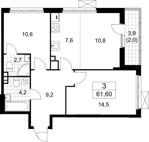 3-комнатная квартира № 60, 59.60 м2 без отделки 3 эт.