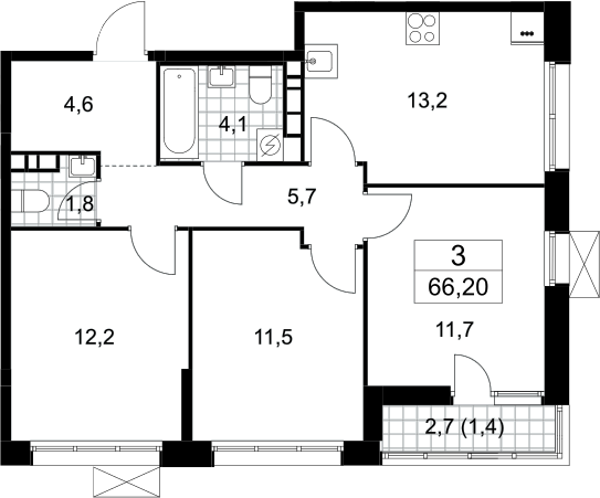 3-комнатная квартира № 254, 64.80 м2 с отделкой 6 эт.