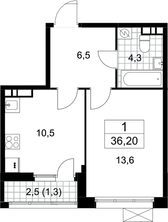 1-комнатная квартира № 294, 34.90 м2 с отделкой 6 эт.