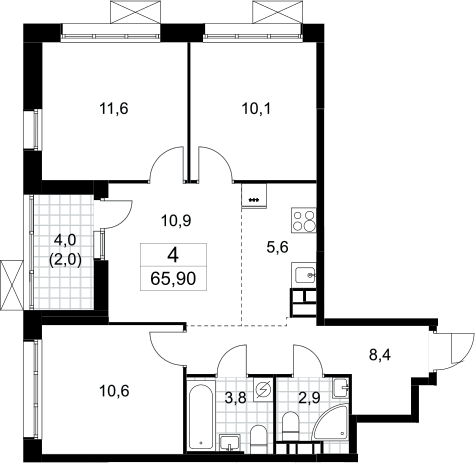 4-комнатная квартира № 382, 63.90 м2 с отделкой 5 эт.