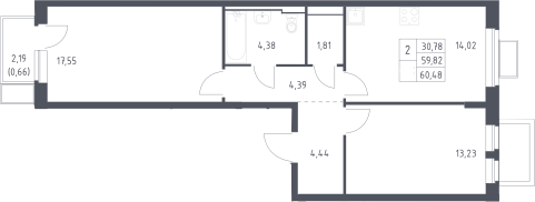 2-комнатная квартира № 154, 59.82 м2 с отделкой 13 эт.