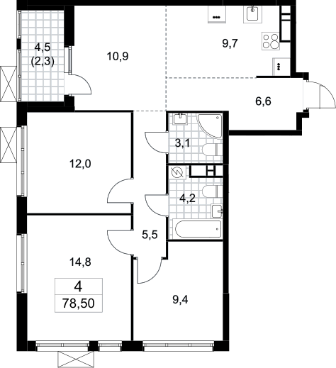 4-комнатная квартира № 441, 76.20 м2 с отделкой 11 эт.