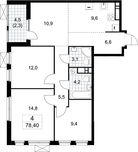 4-комнатная квартира № 471, 76.10 м2 с отделкой 14 эт.